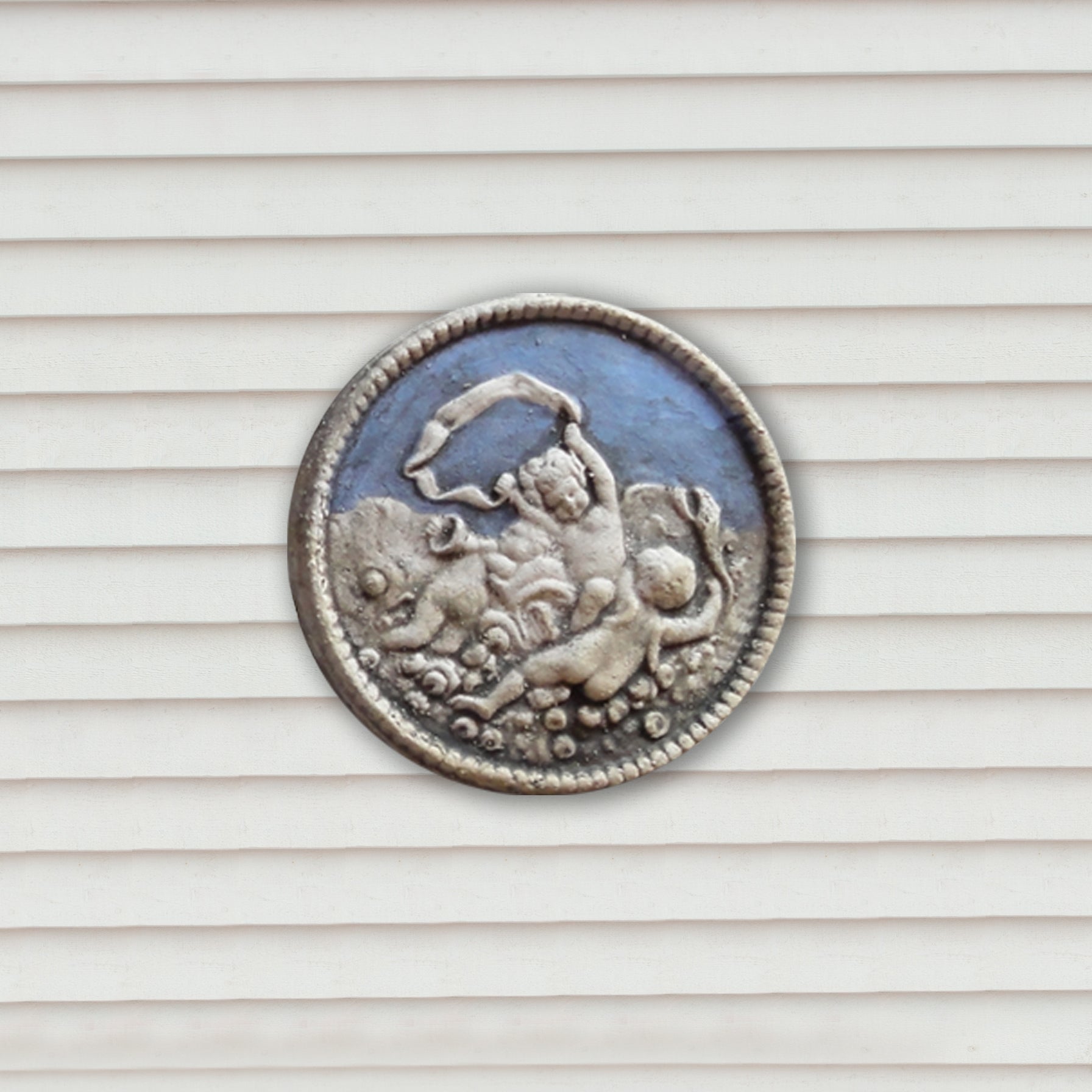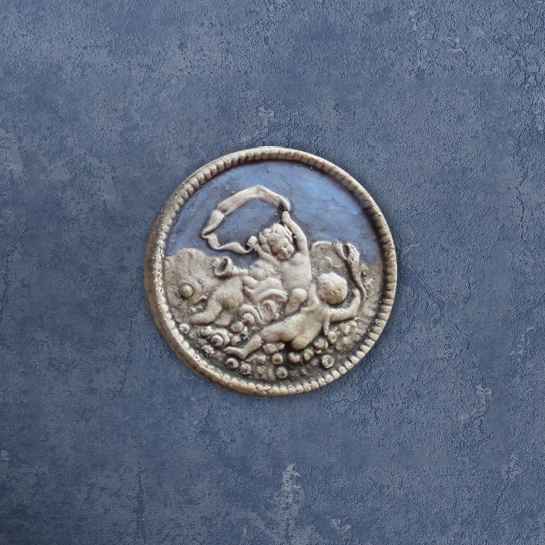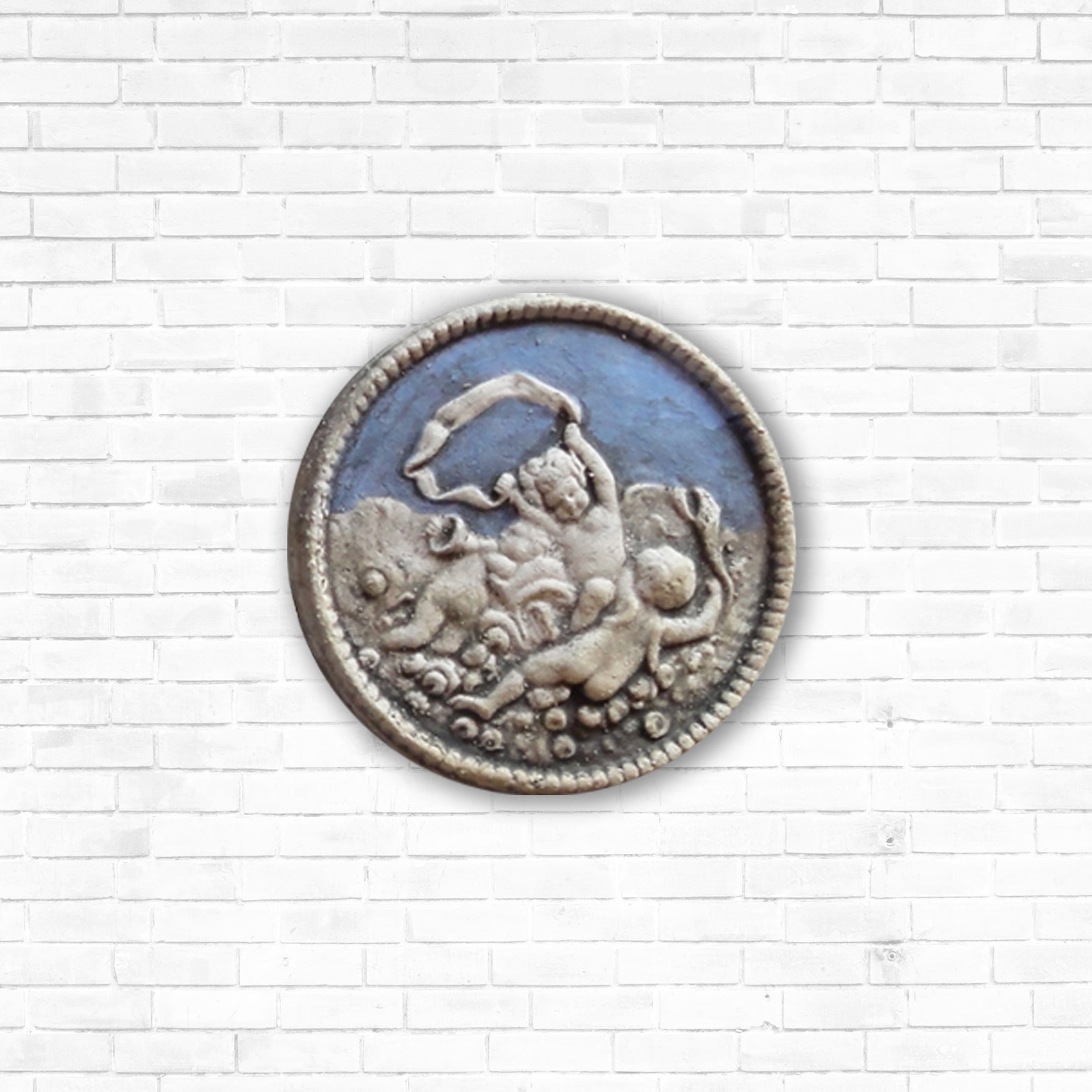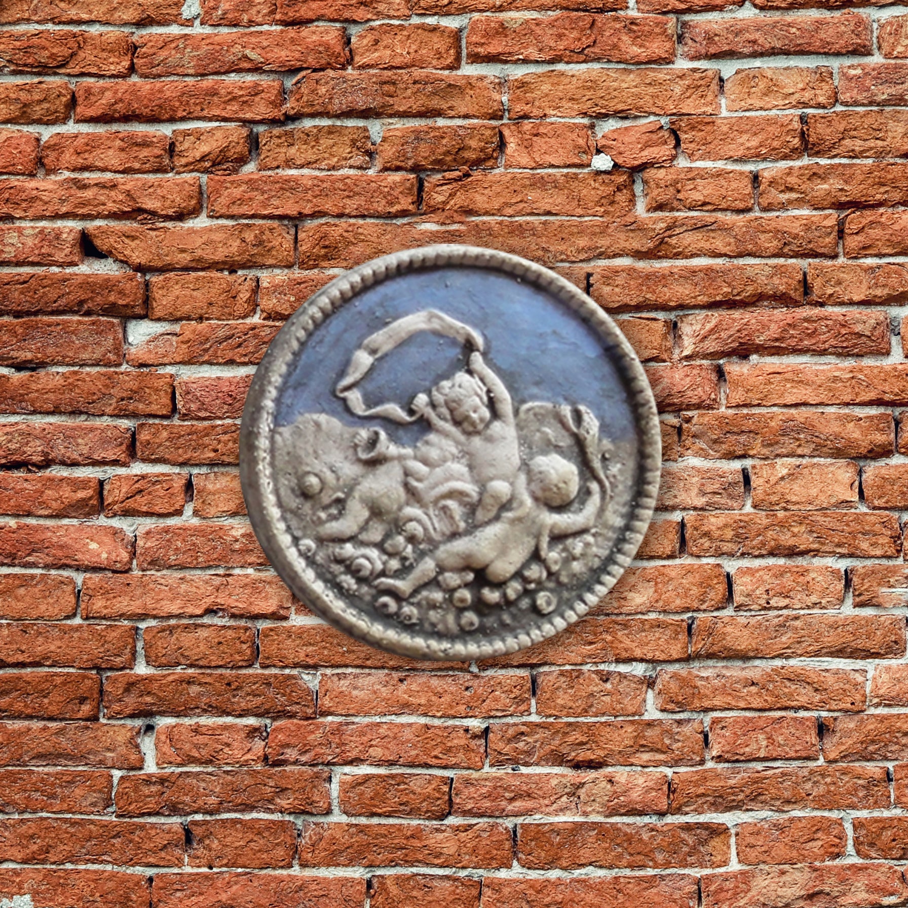 Das wunderschöne, handgefertigte kleine Flachrelief zeigt drei musizierende Putti im Himmel. Die Kamee, inspiriert von einem neoklassischen Edelstein, ist in verschiedenen Farben und Glasuren erhältlich: Hellblau, Türkis, Blau, Grün und Lila.