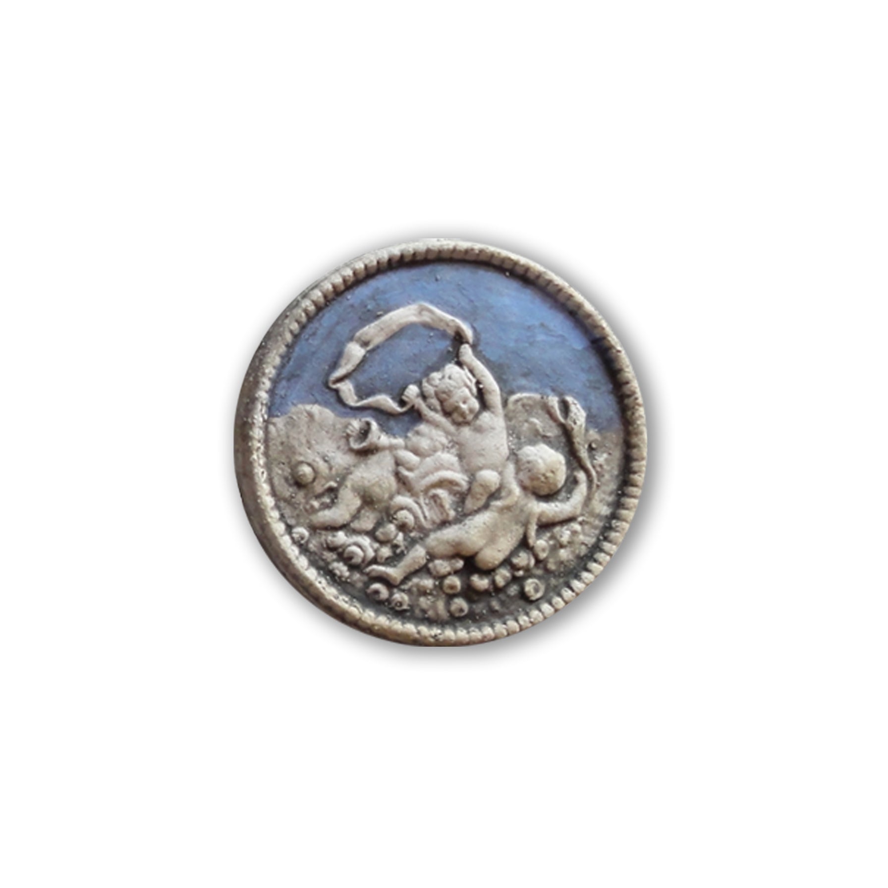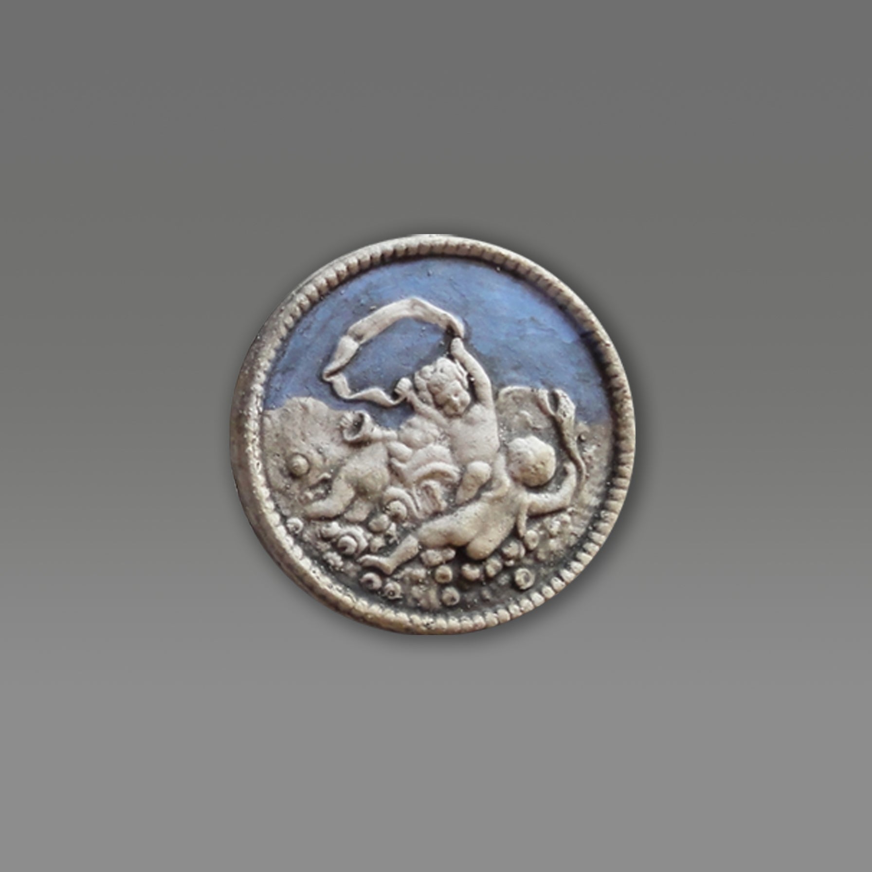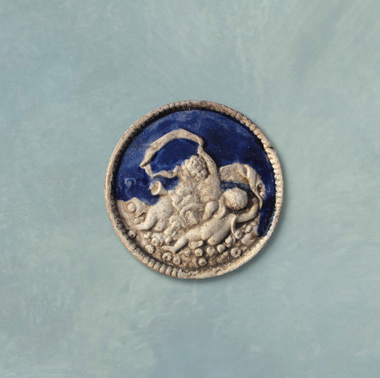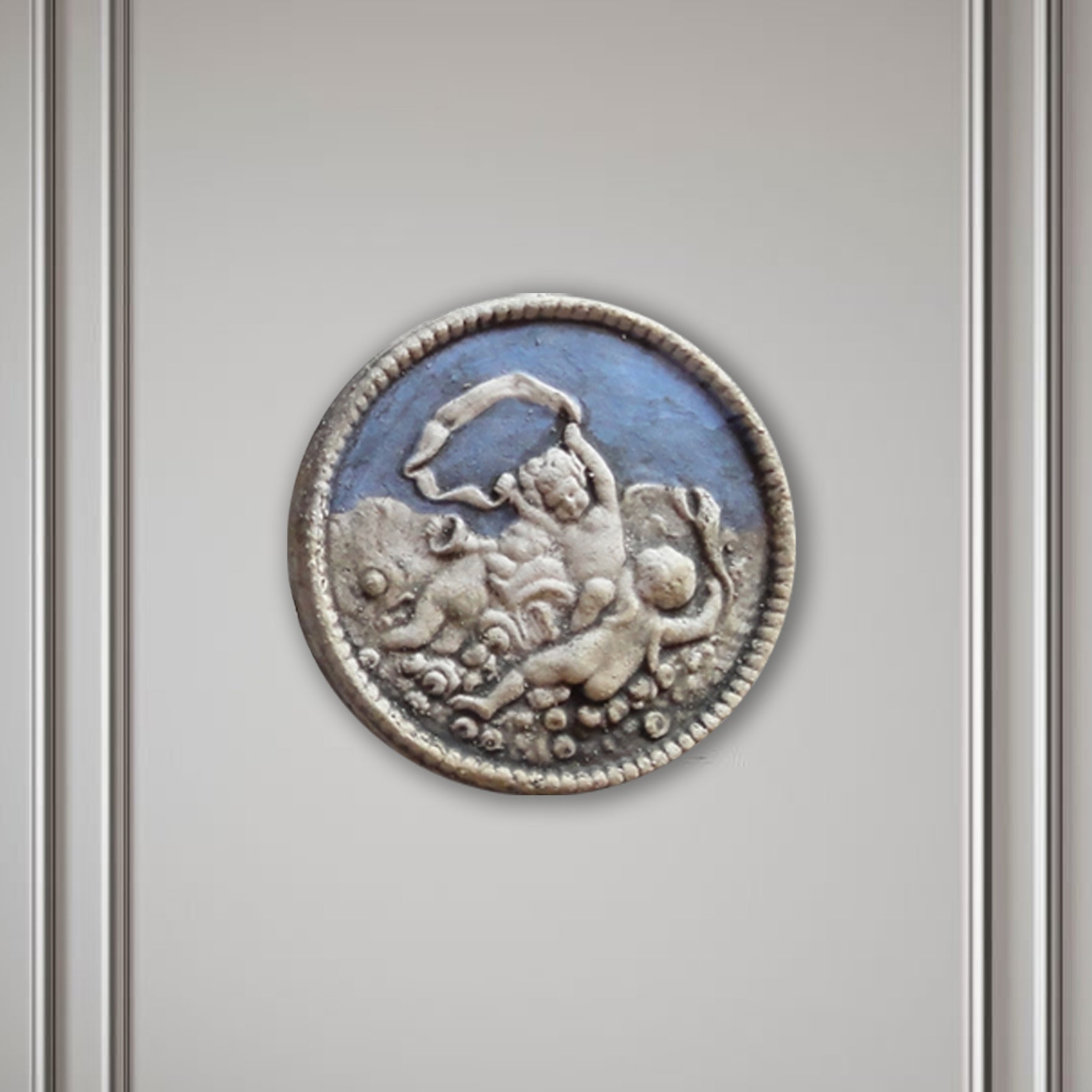Das wunderschöne, handgefertigte kleine Flachrelief zeigt drei musizierende Putti im Himmel. Die Kamee, inspiriert von einem neoklassischen Edelstein, ist in verschiedenen Farben und Glasuren erhältlich: Hellblau, Türkis, Blau, Grün und Lila.