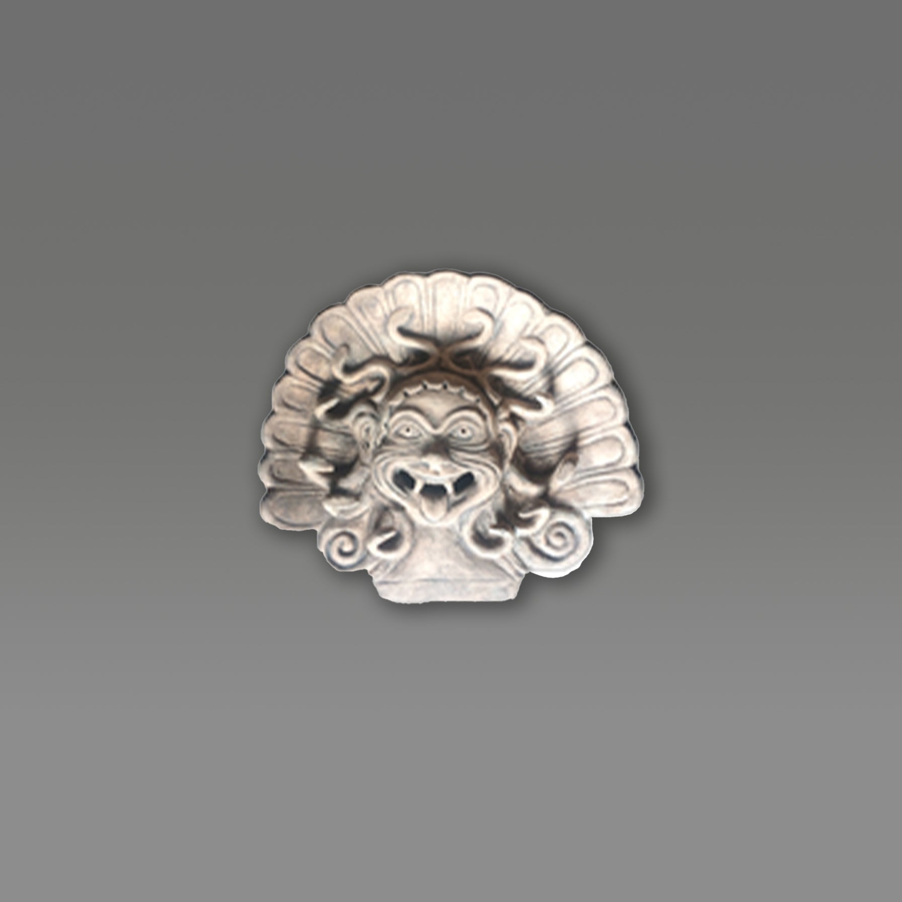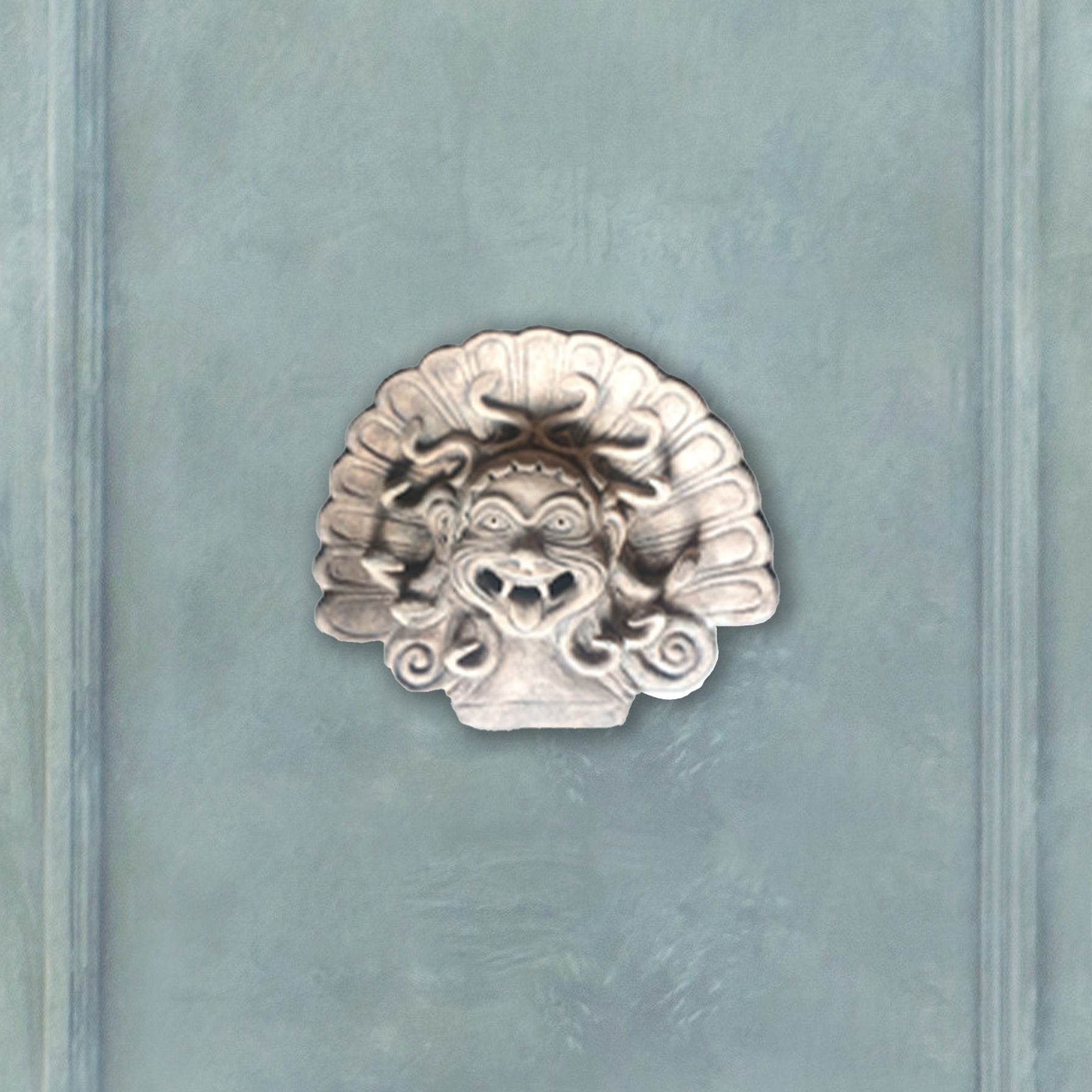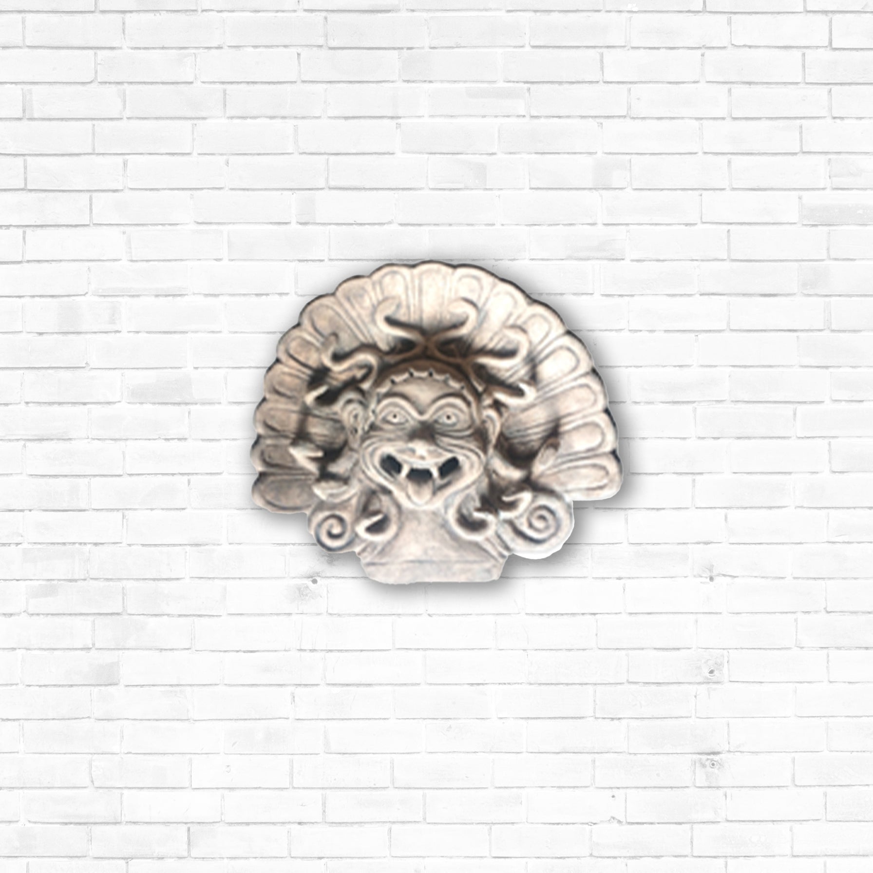 Bemerkenswerte, handgefertigte Skulptur aus Terrakotta, die nach antiken Techniken modelliert wurde. Die Inspirationsquelle dieses Reliefs ist eines der antiken Antefixe, die in Veii (525–500 v. Chr.) gefunden wurden und jetzt im Museo di Villa Giulia in Rom aufbewahrt werden.