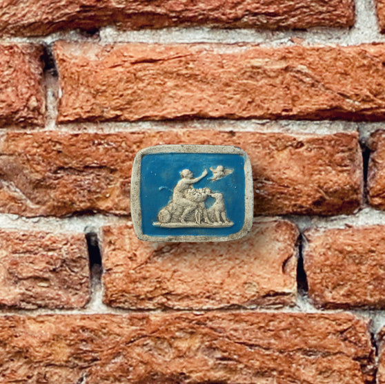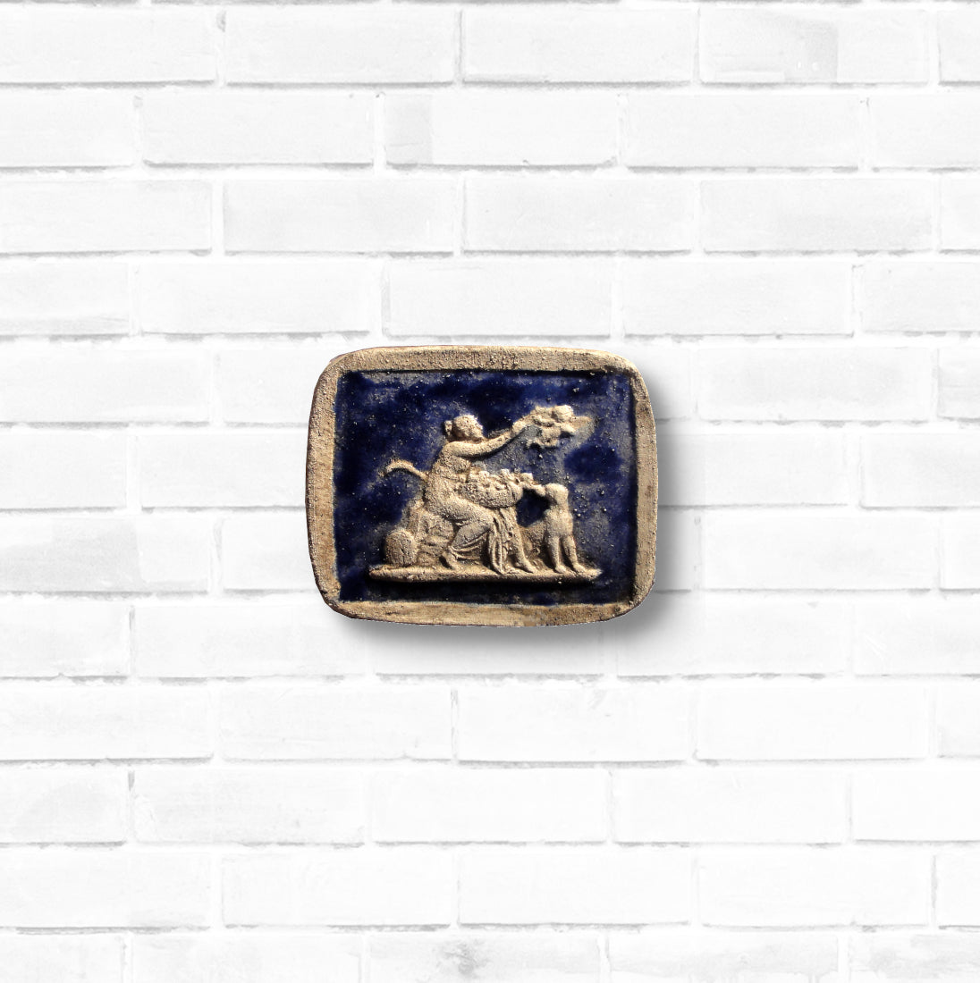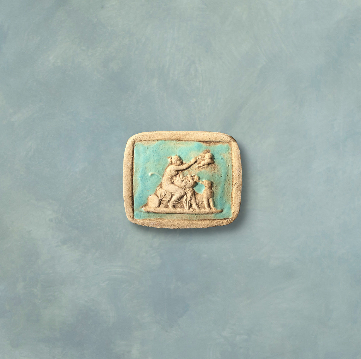 Feines, handgefertigtes kleines Flachrelief, das eine junge Frau zeigt, die neben einem Korb voller Amoretten sitzt, von denen einer wegfliegt. Diese elegante Kamee ist in verschiedenen Farben und Glasuren erhältlich: Hellblau, Türkis, Blau, Grün, Gelb und Lila.
