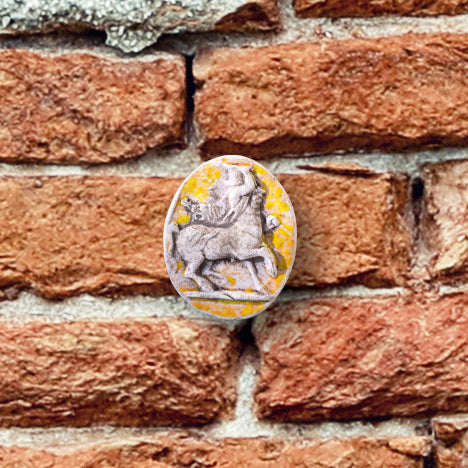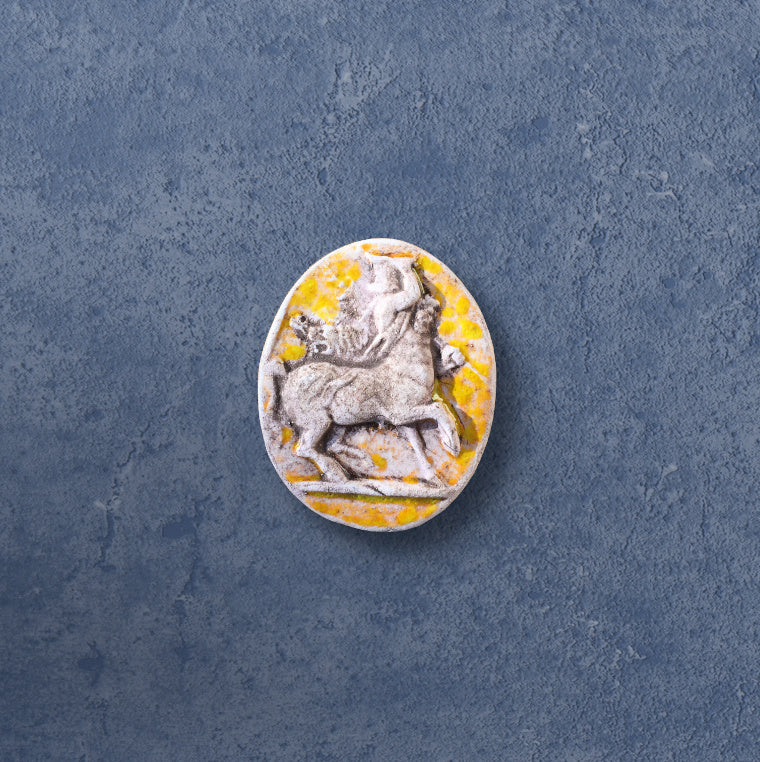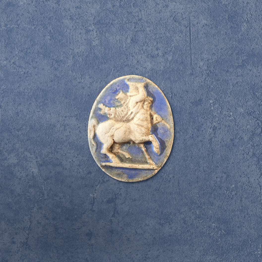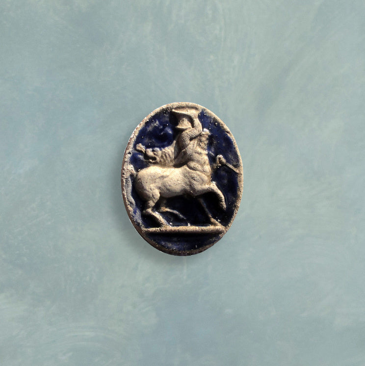 Raffiniertes, handgefertigtes kleines Basrelief mit der Darstellung eines Zentauren, eines mythologischen Wesens mit dem Oberkörper eines Mannes und den unteren Gliedmaßen eines Pferdes. Die elegante Kamee von Ithaca ist in verschiedenen Farben und Glasuren erhältlich: Hellblau, Türkis, Blau, Grün, Gelb und Flieder.