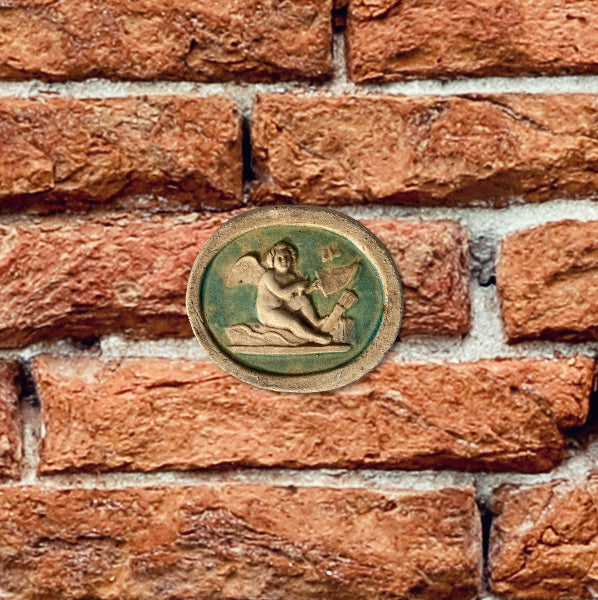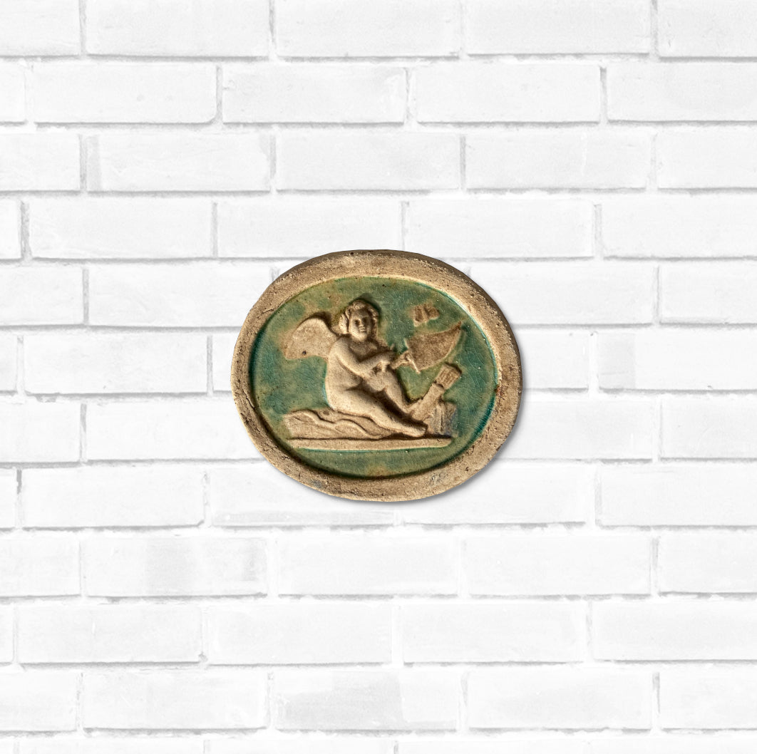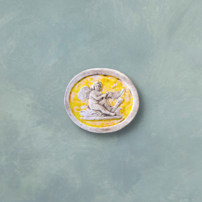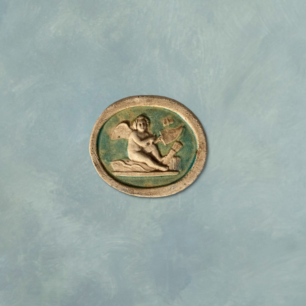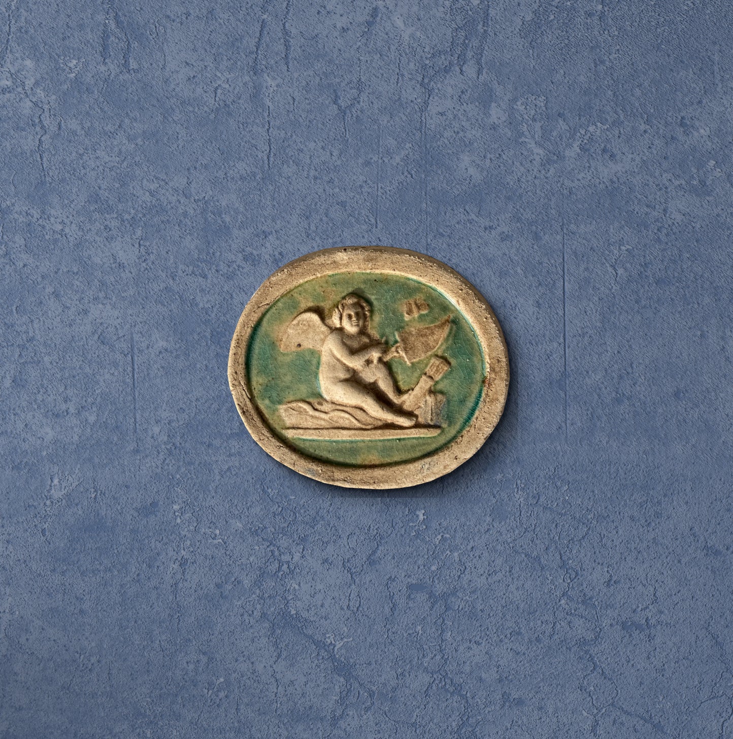 Das kostbare, handgefertigte kleine Flachrelief zeigt Amor, der neben einem fliegenden Schmetterling sitzt. Die Skulptur, die von einer neoklassizistischen  Kamee inspiriert wird, ist in verschiedenen Farben und Glasuren erhältlich: Hellblau, Türkis, Blau, Grün, Gelb und Lila.