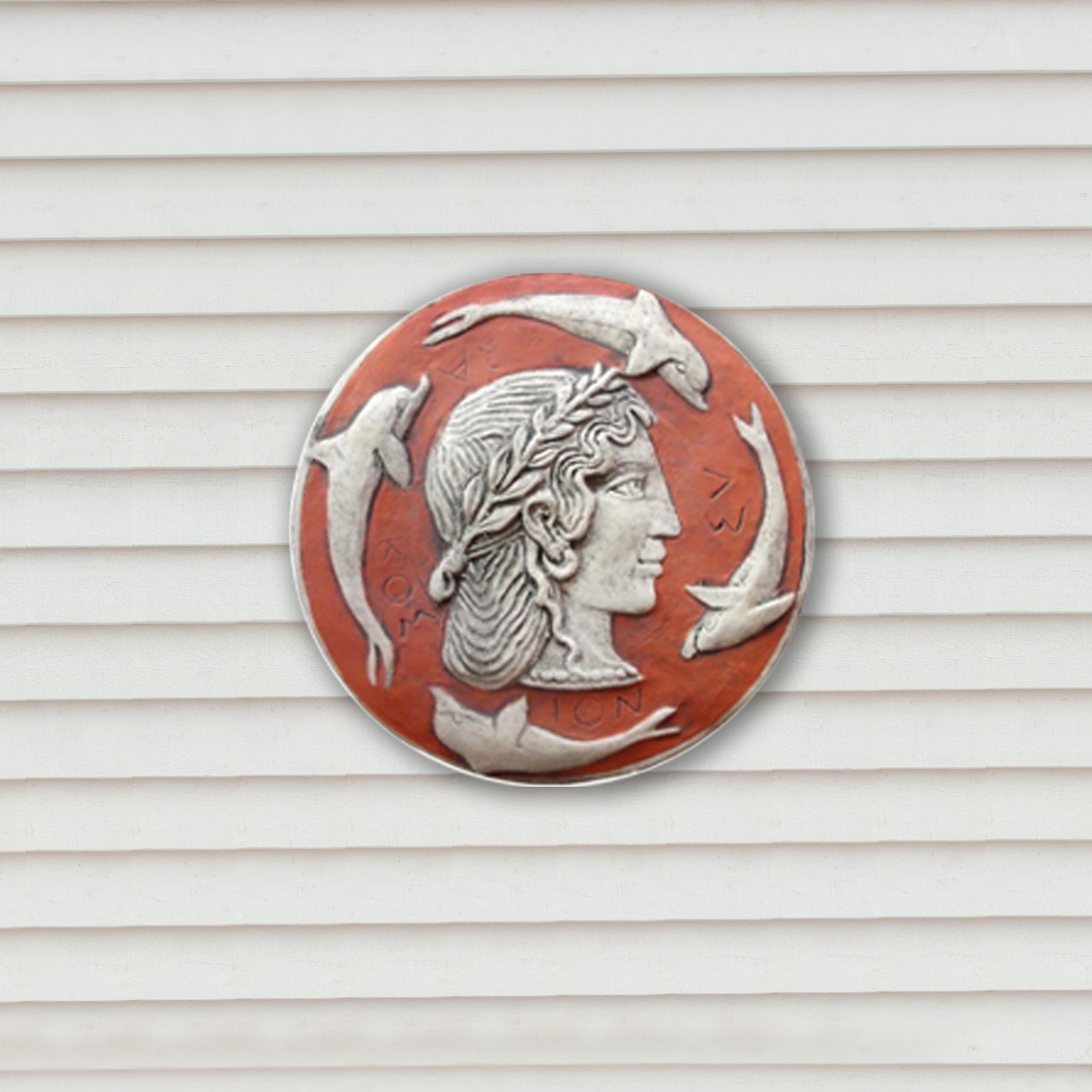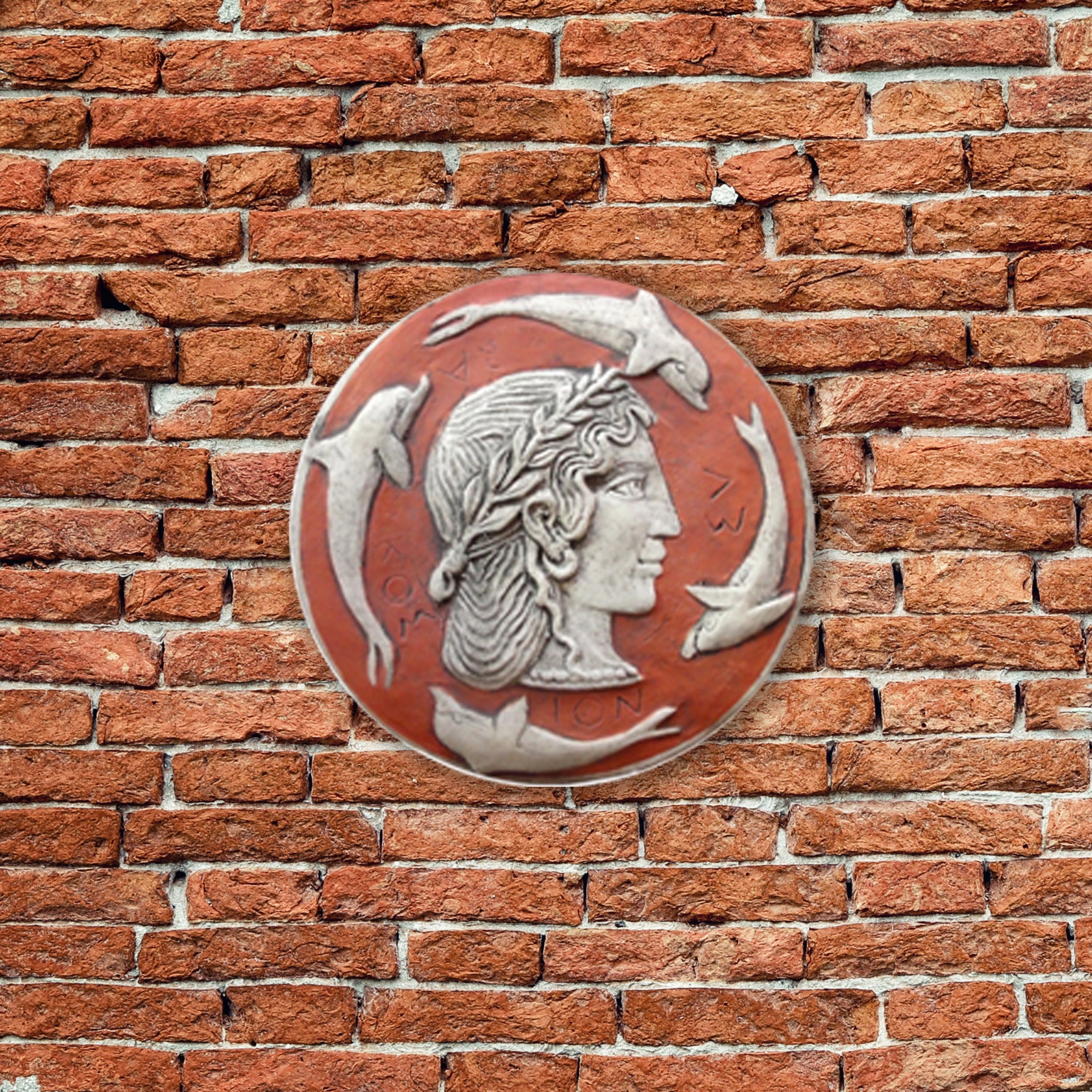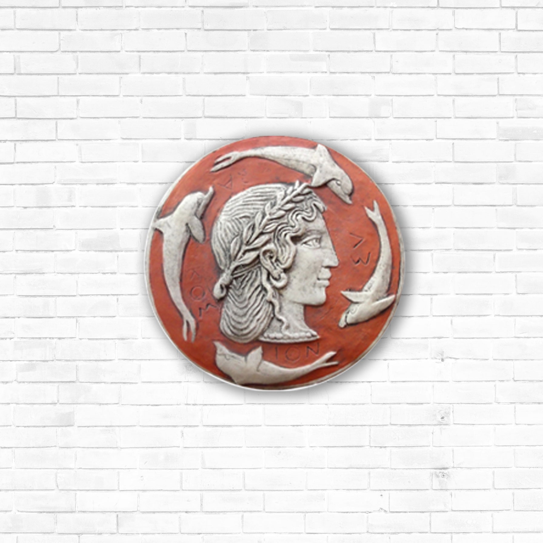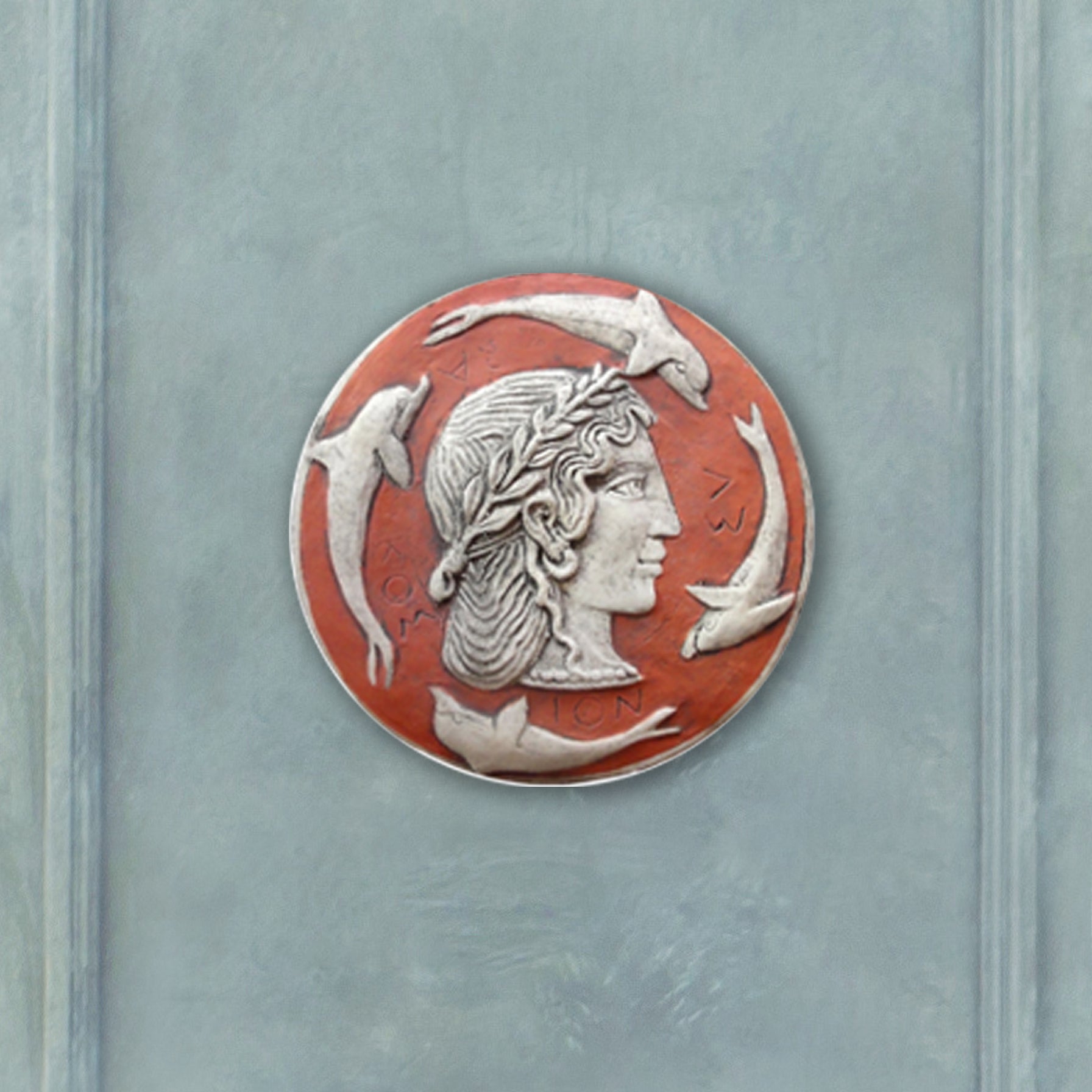 Dieses wunderschön handgefertigte Flachrelief ist von der berühmten sizilianischen Münze „Demareteion“ inspiriert, die von Demarete, der Frau des Tyrannen Gelon, nach der Schlacht von Hymera (480 v. Chr.) ausgegeben wurde. Die Skulptur ist mit Engoben bemalt und bei etwa 970 °C gebrannt: Seine langlebige Qualität bleibt trotz Sonne, Regen, Wind, Kälte und Eis gewährleistet.