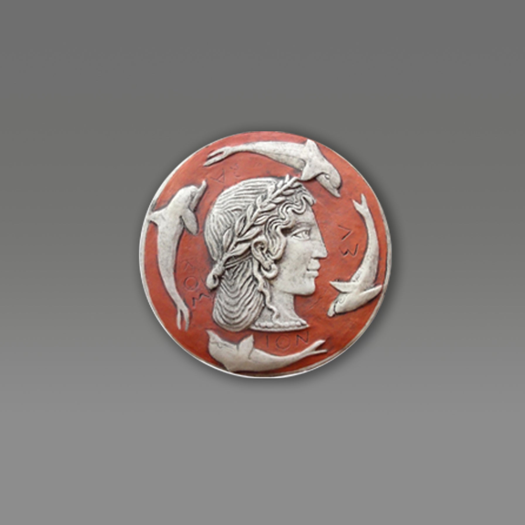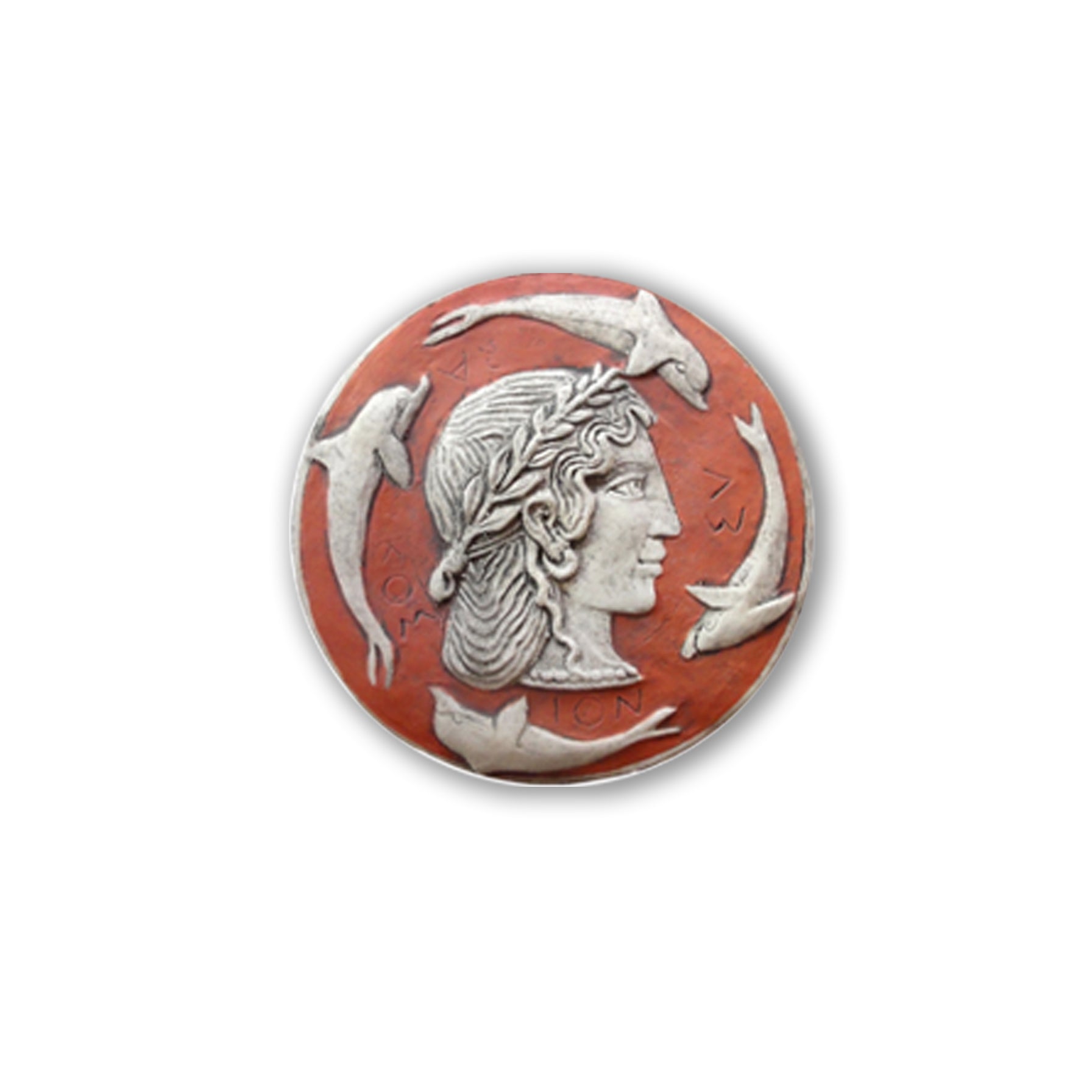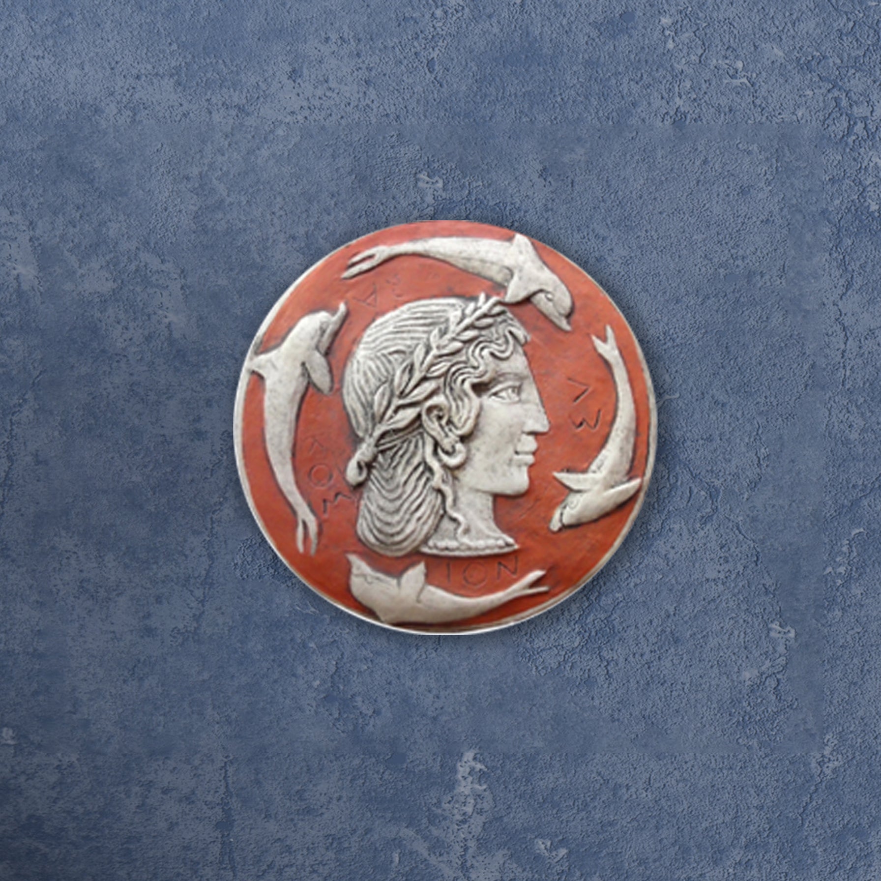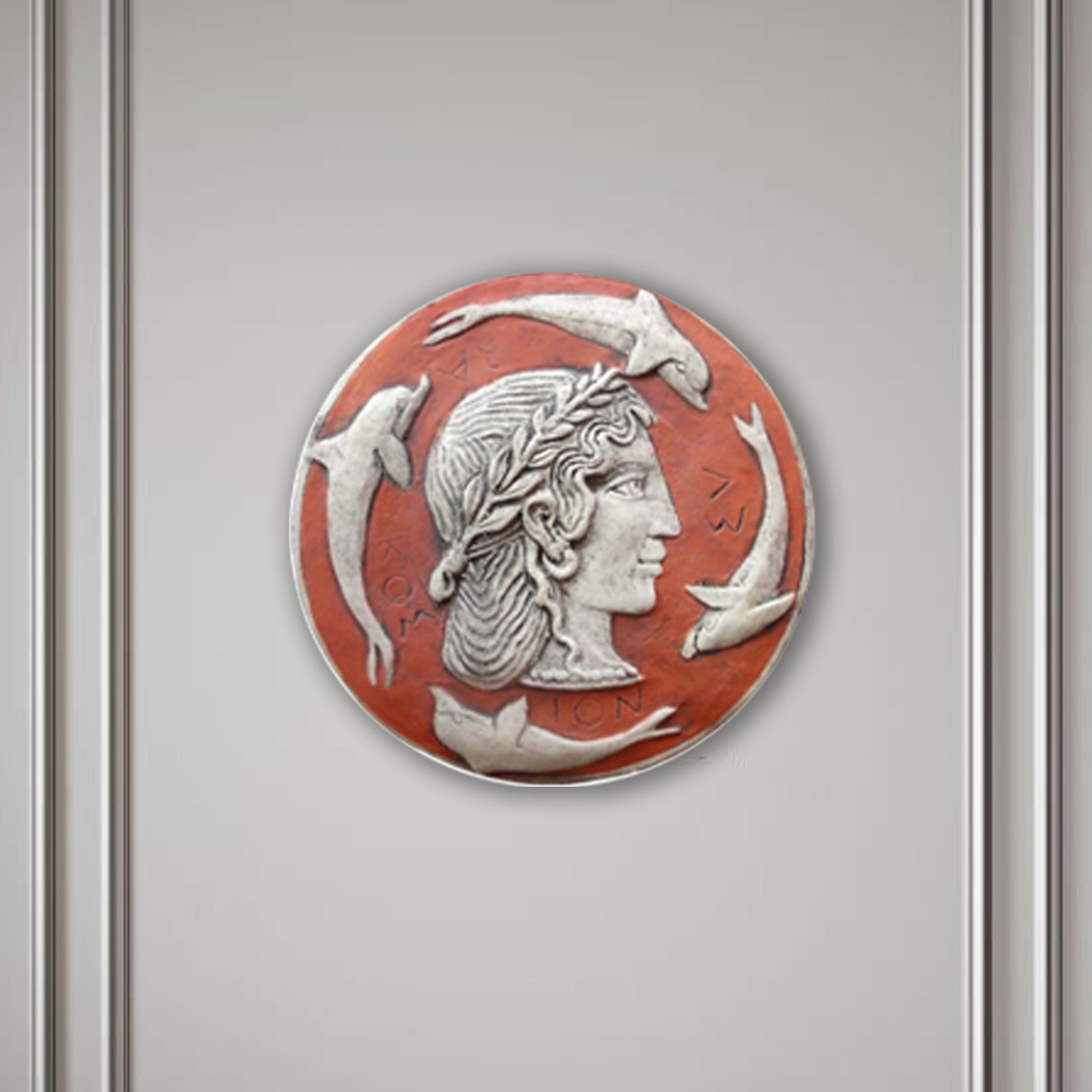 Dieses wunderschön handgefertigte Flachrelief ist von der berühmten sizilianischen Münze „Demareteion“ inspiriert, die von Demarete, der Frau des Tyrannen Gelon, nach der Schlacht von Hymera (480 v. Chr.) ausgegeben wurde. Die Skulptur ist mit Engoben bemalt und bei etwa 970 °C gebrannt: Seine langlebige Qualität bleibt trotz Sonne, Regen, Wind, Kälte und Eis gewährleistet.