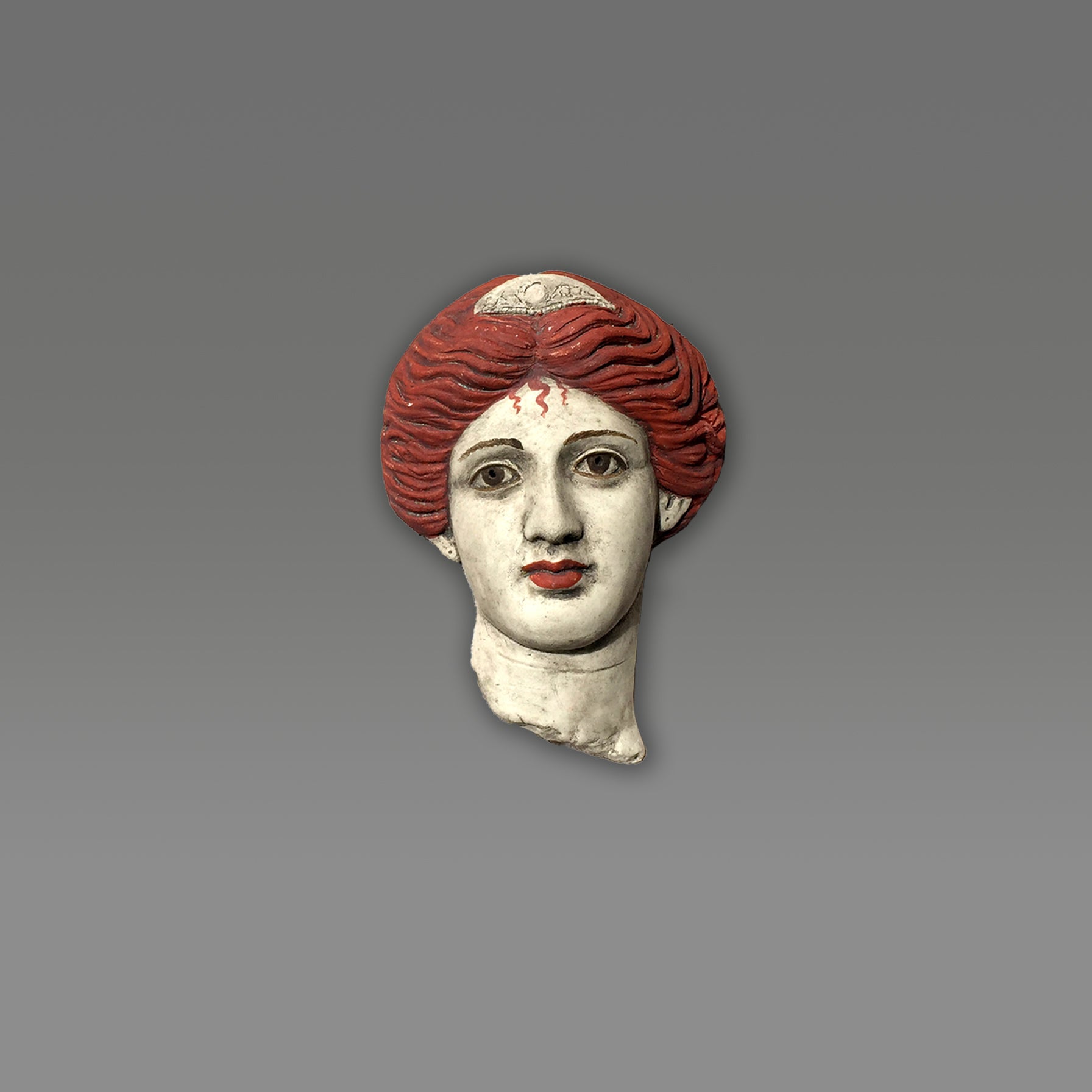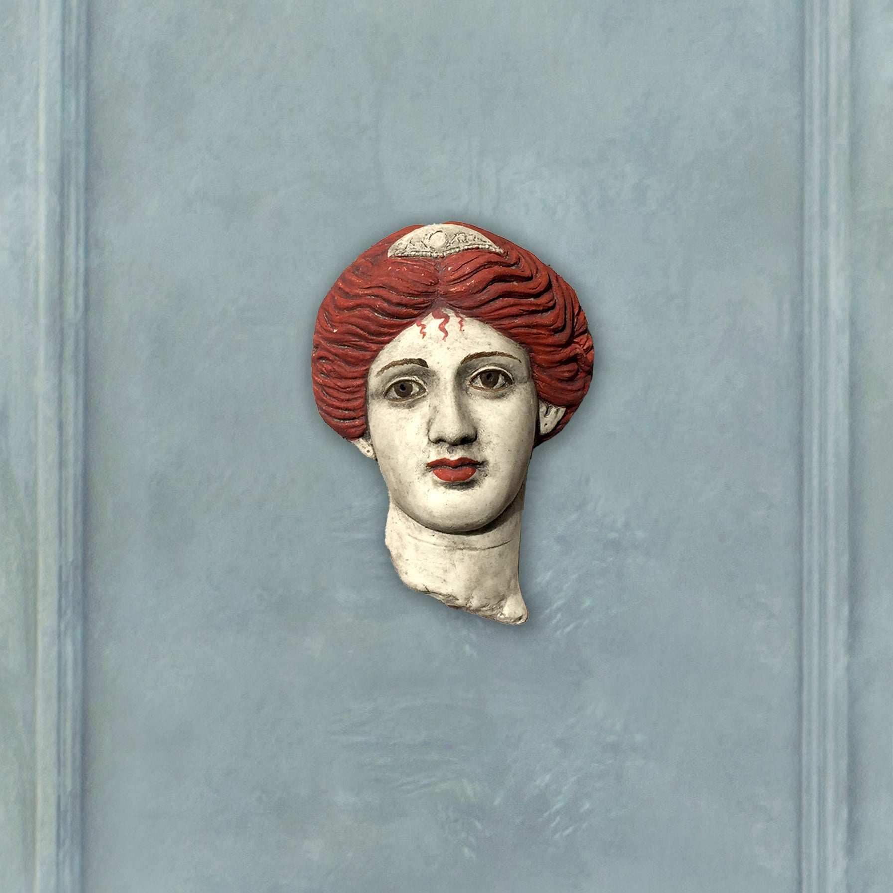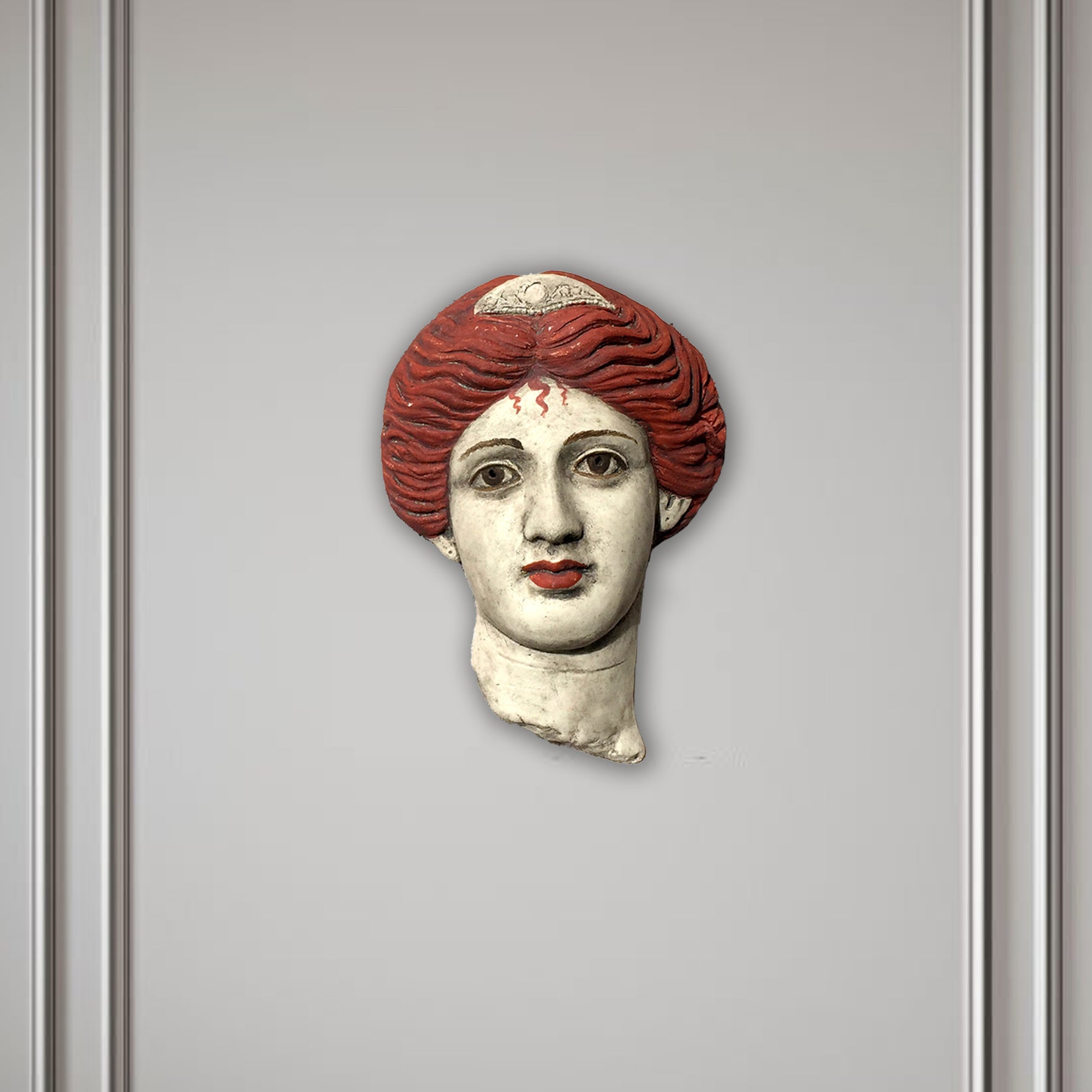 Traumhafte Skulptur aus Terrakotta, mit viel Liebe zum Detail modelliert, mit Engoben bemalt nach antiken Techniken. Diese schöne rothaarige Frau ist inspiriert von einer antiken griechischen Terrakotta aus dem 4. Jahrhundert v. Chr., die heute im Nationalen Archäologischen Museum von Taranto aufbewahrt wird.
