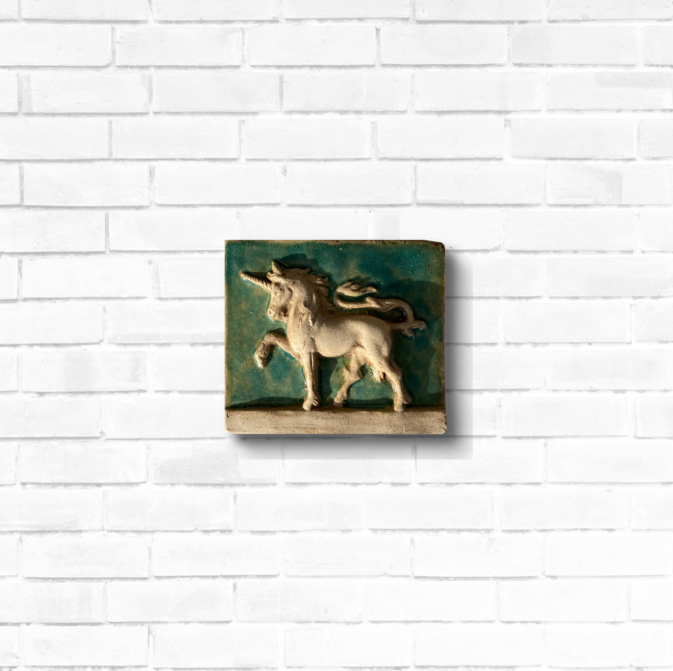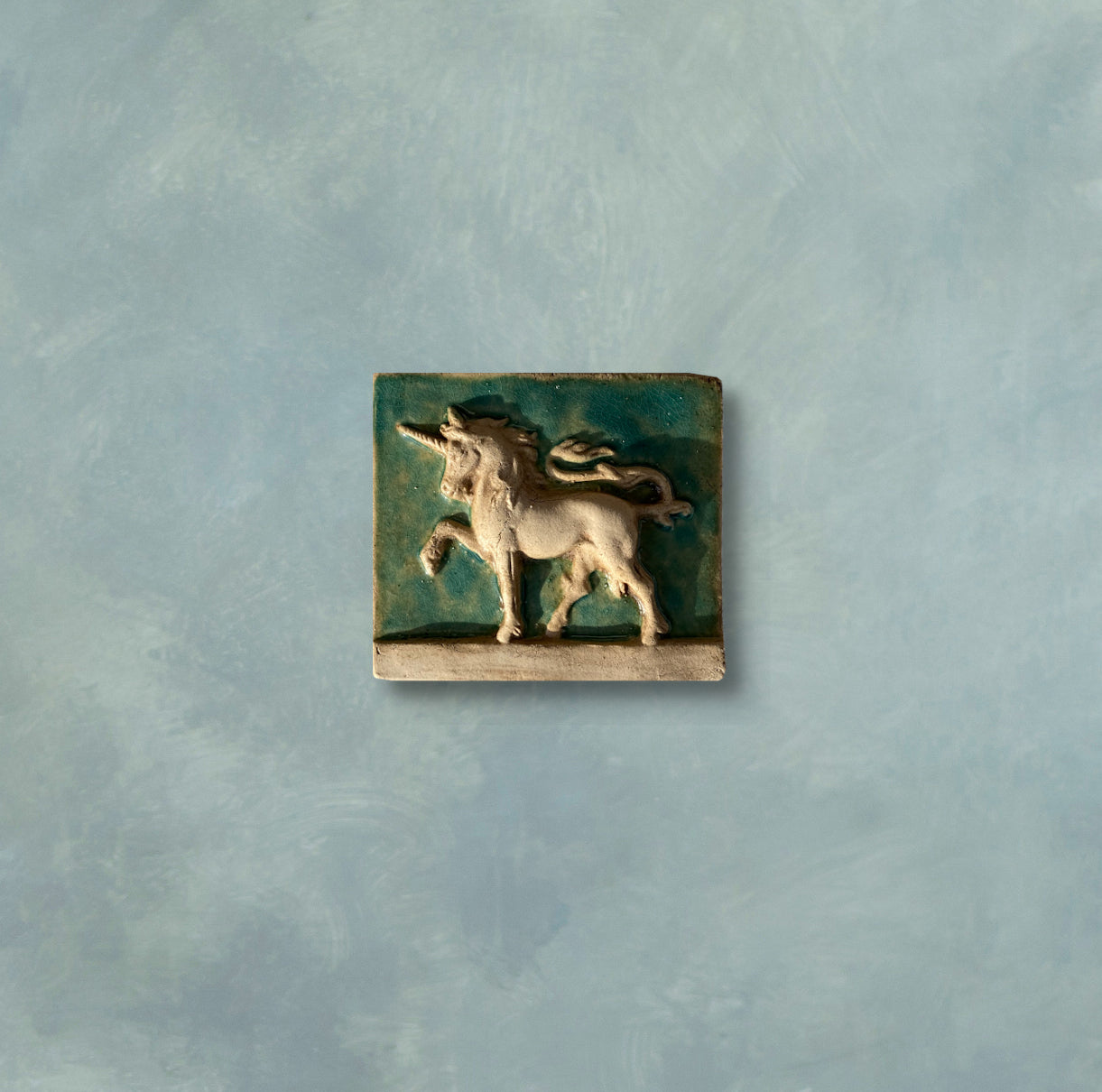 Handgefertigtes, exquisites kleines Flachrelief, das ein stehendes Einhorn darstellt. Erhältlich in verschiedenen Farben und Glasuren, Hellblau, Türkis, Blau, Grün und Lila.